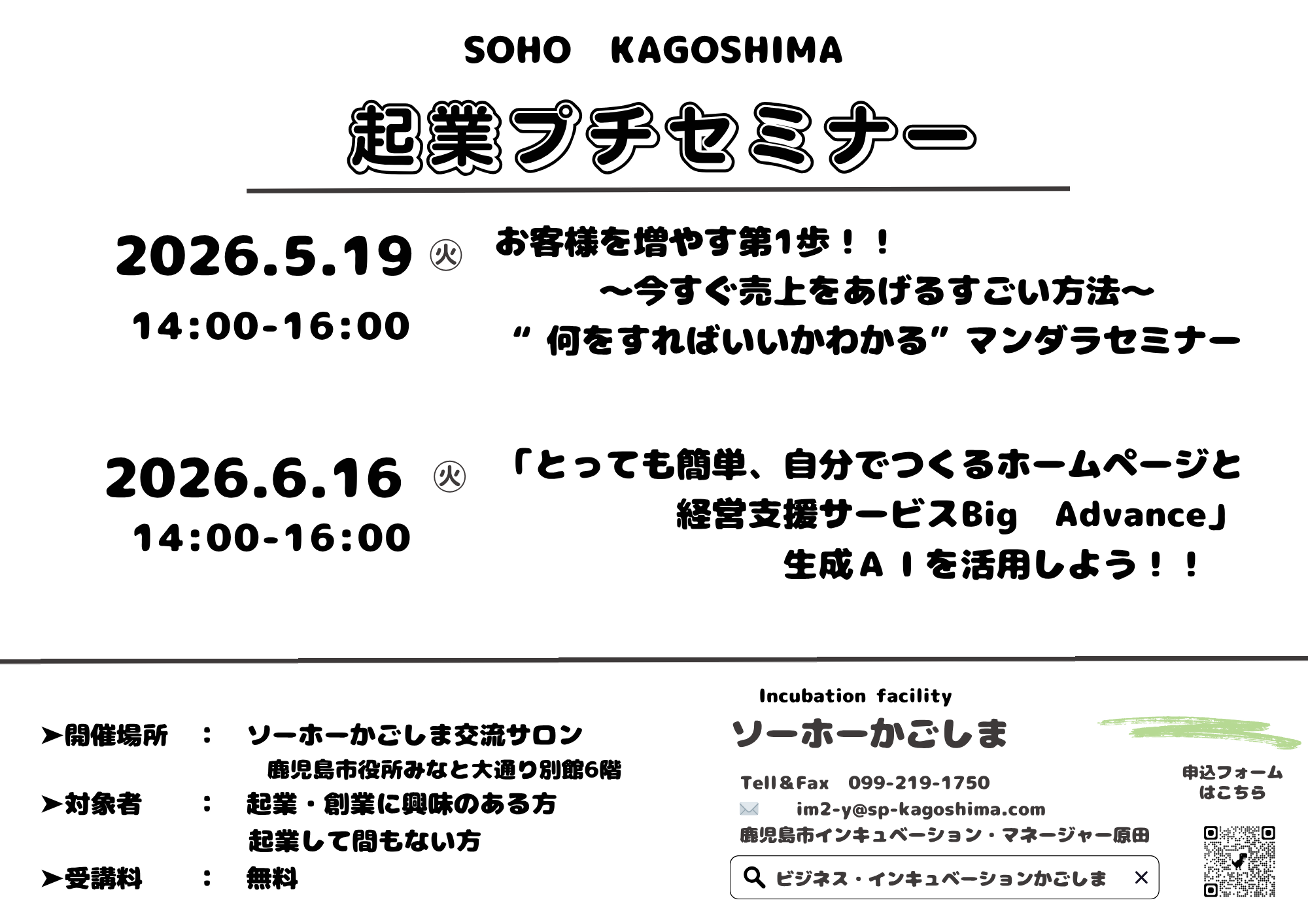 【募集中】ソーホーかごしま起業プチセミナー(5/19(火)分)